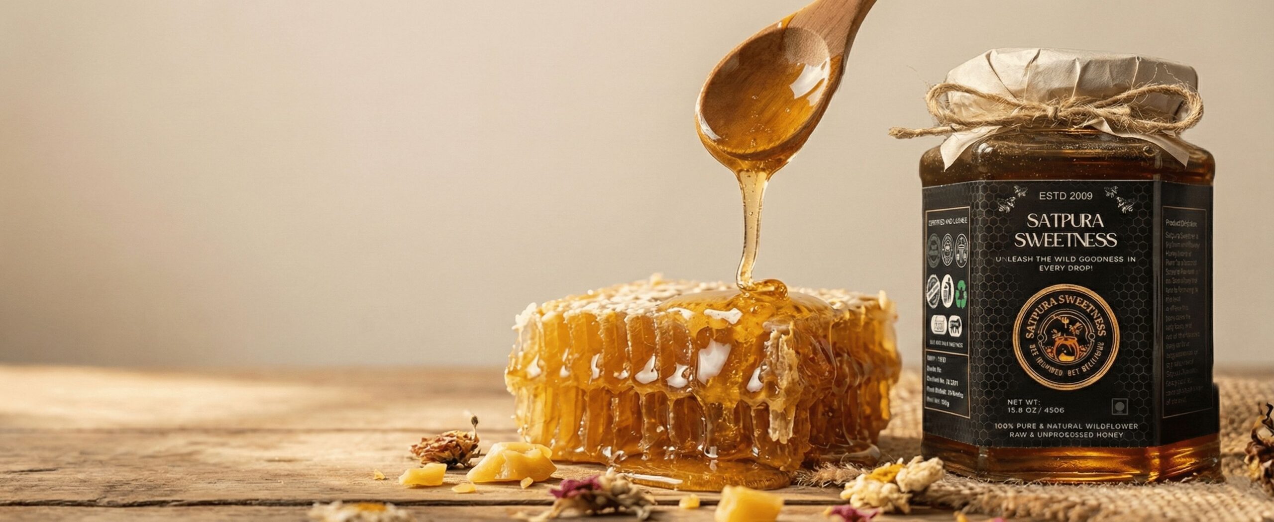 Our raw honey is sourced from wildflowers of the Satpura range, Pachmarhi, and extracted using traditional cold-extraction methods.